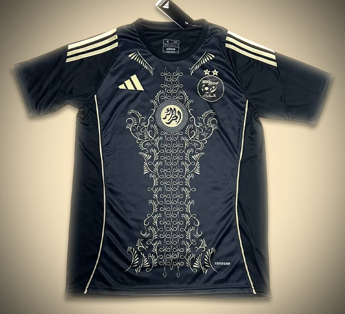 Le torse est habillé d’un motif symétrique complexe en doré, encadré par des bandes verticales sur les flancs. L’emblème circulaire et le logo de la fédération algérienne de football complètent la composition. Matière fluide en polyester, sans col rond ni sponsor apparent.