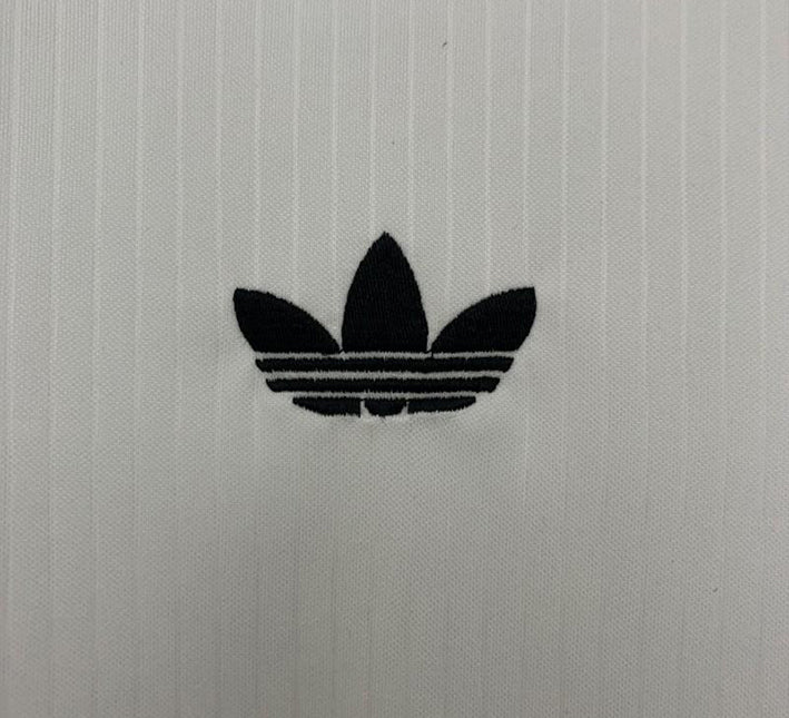 Modèle visuel à l'esthétique épurée, dominé par un blanc uni avec col et extrémités de manches noirs. Le badge circulaire en noir rend hommage aux 125 ans du football allemand, avec l’inscription “125 Jahre Deutscher Fussball-Bund” autour d’un monogramme central. Le logo à gauche de la poitrine rappelle les anciens symboles utilisés dans les tenues classiques. Ce modèle entre dans la catégorie des maillots de foot Allemagne au style rétro.