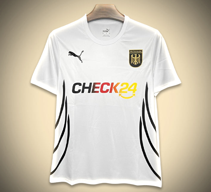 Modèle visuel blanc agrémenté de griffes noires stylisées sur les flancs, accompagné d’un badge noir et or “Deutschland” brodé côté cœur. Le visuel central comporte le marquage “CHECK24” en dégradé noir, rouge et jaune, clin d’œil aux couleurs nationales. Le logo félin sur la poitrine complète le look. Le modèle fait partie des maillots de foot Allemagne en version réplique visuelle.