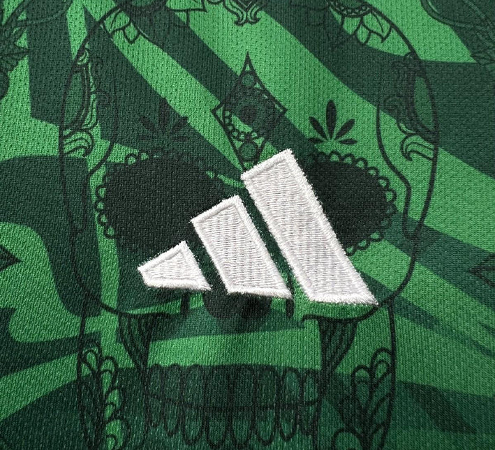 Le motif principal rend hommage à l’héritage aztèque, avec ses crânes stylisés, formes géométriques tribales et détails symétriques qui captivent le regard. L’écusson brodé de la sélection mexicaine trône fièrement sur la poitrine, contrastant parfaitement avec la teinte verte mythique du maillot domicile El Tri.