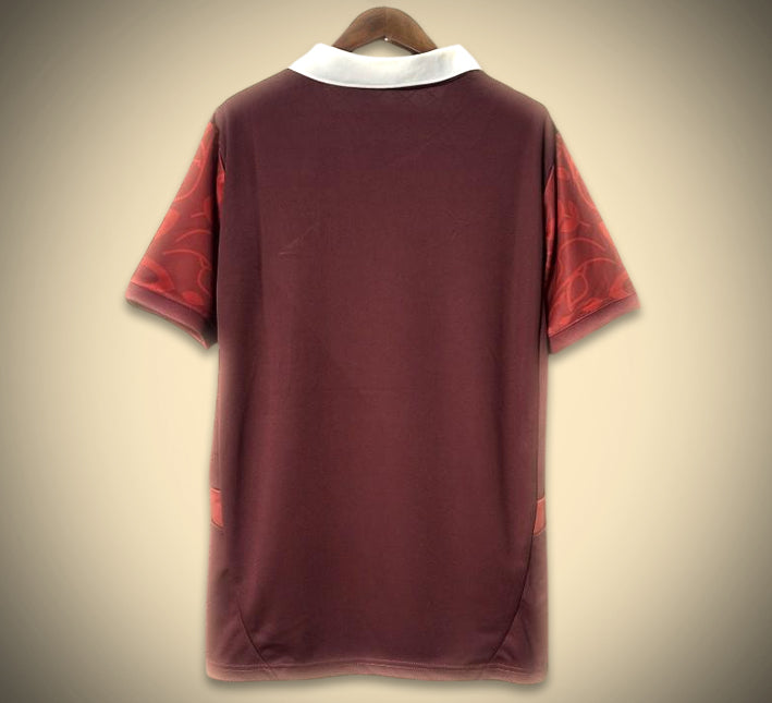 Le maillot Portugal rouge présente un fond bordeaux profond rehaussé d’un motif floral stylisé, symbolisant la richesse culturelle et artistique du pays. Le col blanc rigide façon polo rappelle les maillots vintage des grandes époques. L’écusson de la FPF est brodé côté cœur, accompagné du logo Puma en blanc.
