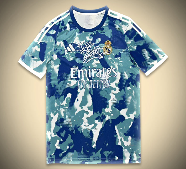 🟦 Un style urbain, assumé et percutant : le maillot concept du Real Madrid affiche un motif camouflage moderne en tons bleus et blancs qui casse tous les codes traditionnels. 🎨 Les contrastes visuels dynamiques évoquent à la fois l'énergie de la rue et la puissance du Bernabéu. Avec l’inscription “Real Madrid” en graffiti stylisé, le message est clair : le club s’impose partout, sur et en dehors du terrain. 🔥