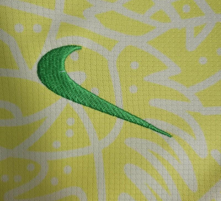 Matière : polyester, impression par sublimation. Coupe droite unisexe, manches courtes. Motifs discrets, fond jaune vif, éléments contrastés verts — ensemble visuel directement associé à l’image historique du maillot Brésil domicile.