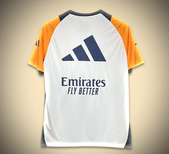 ⚽ Prépare-toi comme les pros avec le maillot d'entraînement Real Madrid 24/25 ! Avec son look tricolore saisissant – blanc, noir charbon et manches orange – ce modèle avant-match est conçu pour faire monter la température sur le terrain comme en dehors 🔥