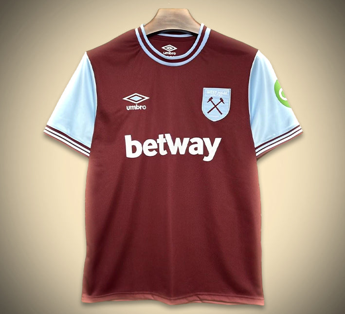 Le blason West Ham United est brodé sur la poitrine avec les deux marteaux croisés, accompagné du logo Umbro et du sponsor Betway en blanc, parfaitement centrés. L'esthétique générale reste sobre mais puissante, un clin d’œil aux valeurs historiques du club londonien.